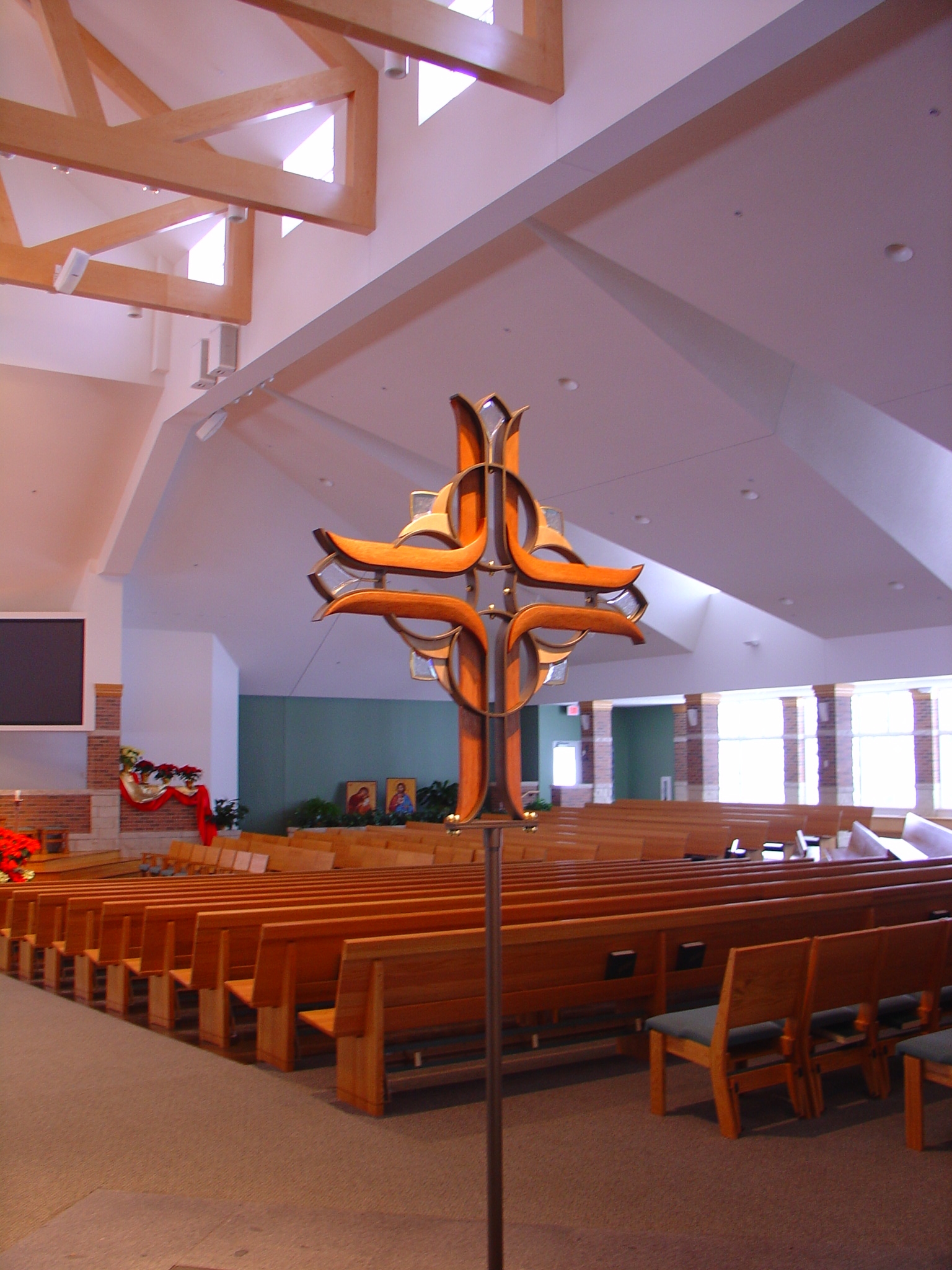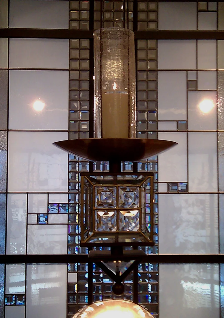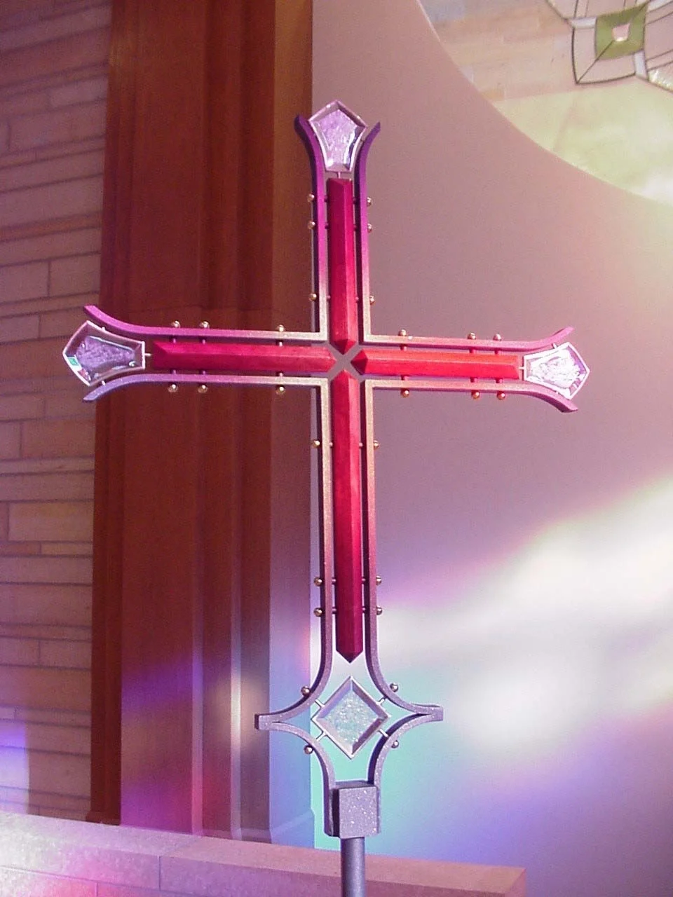 Liturgical commissions such as Tabernacles, Altar Screens, Processional and Monumental Crosses, candleholders, stained glass, painted glass, and etched glass are one of a kind and designed to fit the individual worship space.